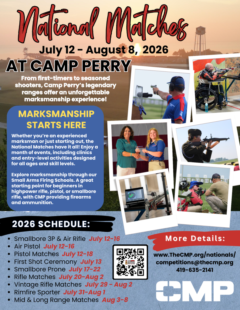 CMP’s National Matches are open to the public and we encourage all marksman to participate in the Historic National Matches at Camp Perry in Port Clinton, Ohio. Watch our video below or contact our staff with any questions you may have – (419) 635-2141 or email [email protected]. Registration is open, we hope to see you on the firing line soon!