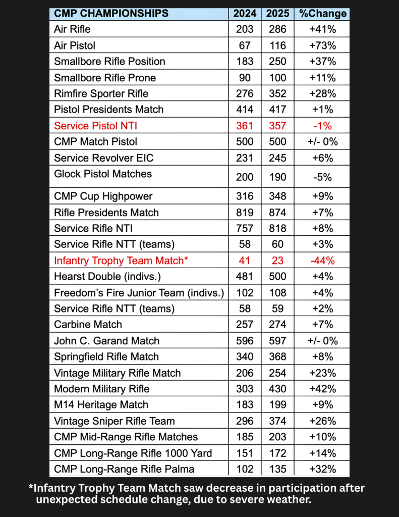 Great recap of the 2025 shooting season and all that transpired within the CMP this year. One friendly correction on the National Championships Table: President’s Pistol Match numbers appear to be incorrect (low by 100) for both 2024 and 2025.