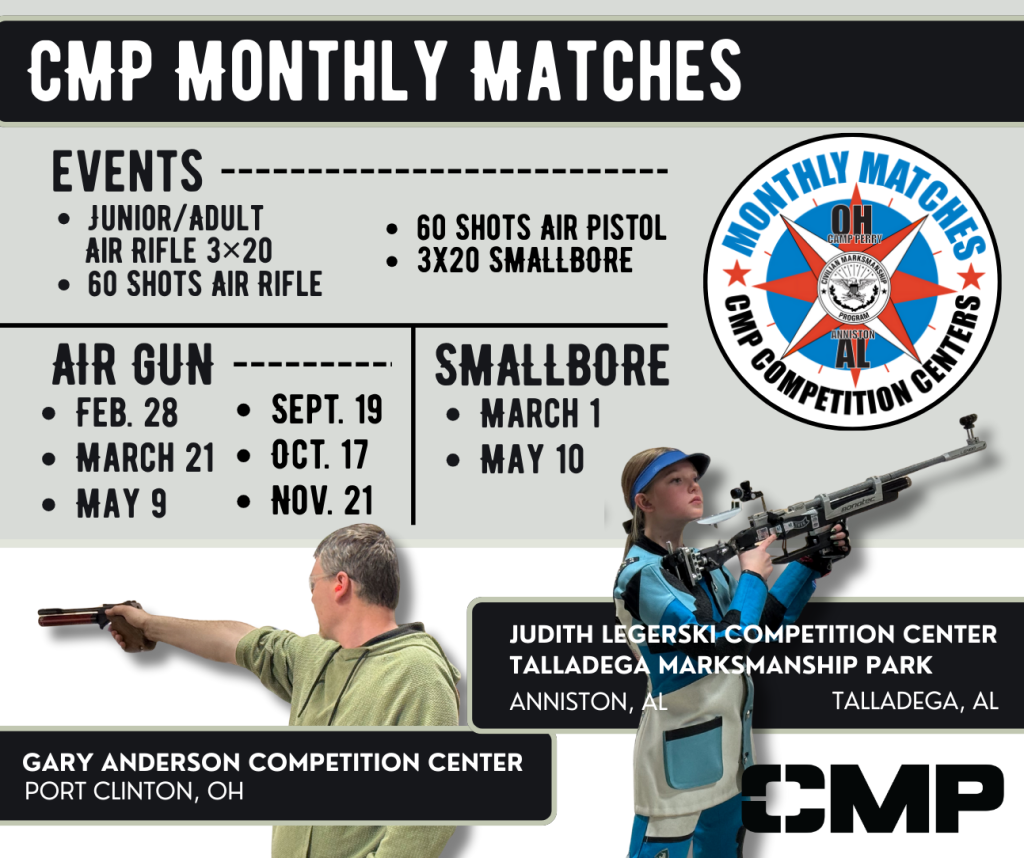 Civilian Marksmanship Program▸The First Shot▸CMP Announces Schedule for 2026 Monthly Air Gun Matches, Plus Smallbore!CAMP PERRY, Ohio; ANNISTON, Ala. – The Civilian Marksmanship Program (CMP) has released its lineup of 2026 Monthly Matches, featuring air rifle and air pistol events for a variety of ages and experience levels.