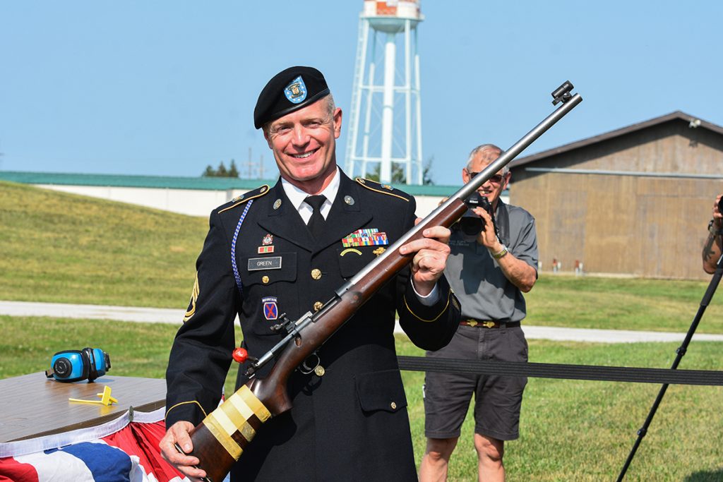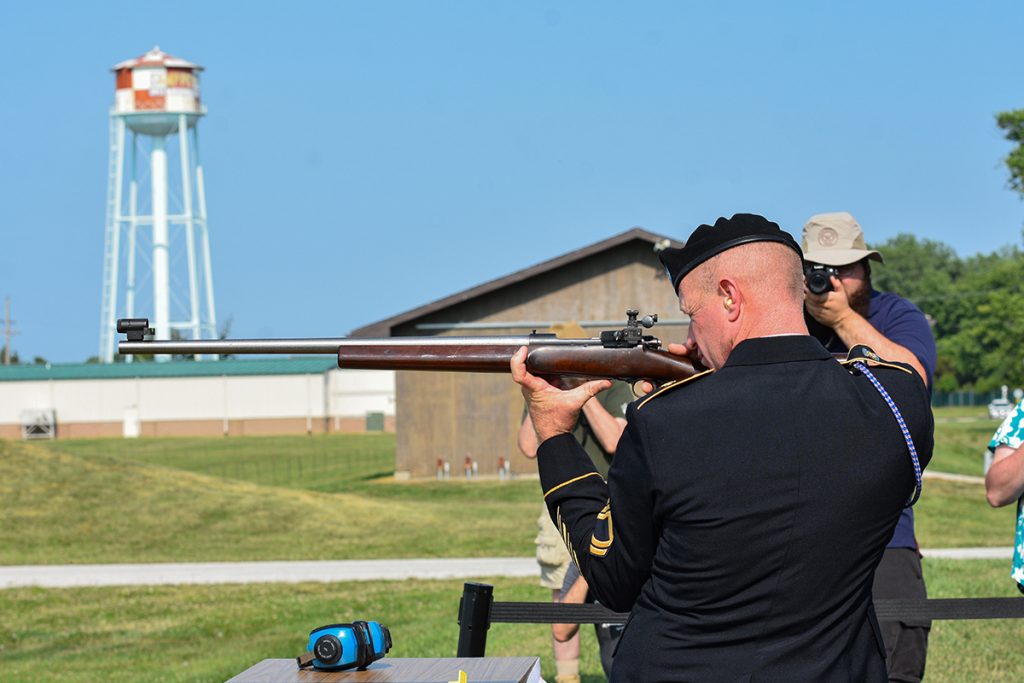 First Shot Speaker, Sgt. 1st Class Brandon Green, USA, fired the M70 bolt rifle used by DCM Emeritus and two-time Olympic Gold Medalist, Gary Anderson, to shoot the National Matches 200-yard standing record in 1971, as well as during the 2014 First Shot Ceremony. SFC Green earned his Junior Air Rifle Distinguished Badge #1 in 2001, Distinguished Rifleman Badge in 2005 and currently holds the President’s Rifle Trophy National Record of 400-20X, set in 2018.